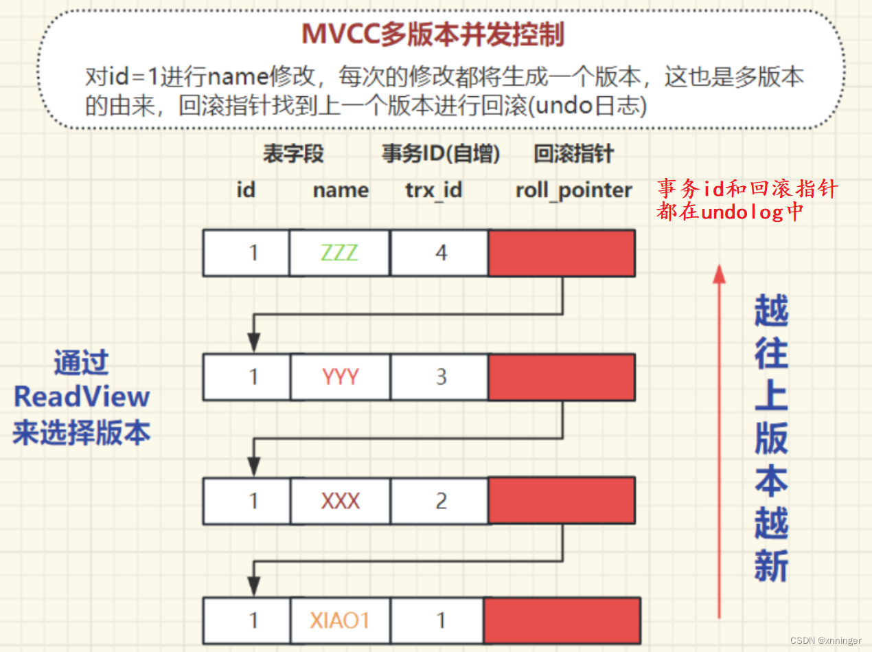 事务执行更新操作时,会先给行数据加排它锁,然后把当前数据快照存在undolog中,拷贝完毕后,再修改行数据,并把回滚指针指向undolog中的版本记录。事务执行期间只需要读undolog中的版本记录即可。
