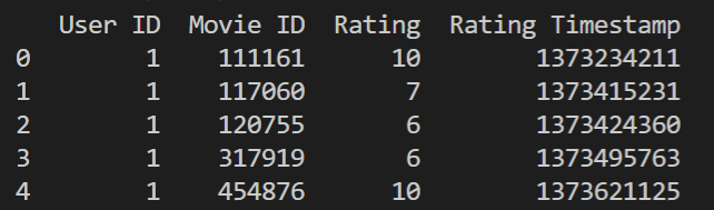 ratings = pd.read_csv('./data/movietweetings/ratings.dat', delimiter='::', engine='python', header=None, names = ['User ID', 'Movie ID', 'Rating', 'Rating Timestamp'])