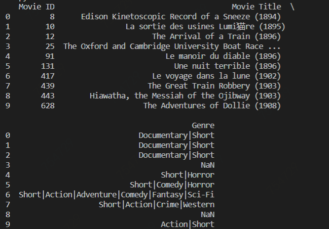 看结果comedy_ids.head(10):第一列为索引列,依然对应movies表的index,第二列为Movie ID,这些电影的Genre都包括comedy.