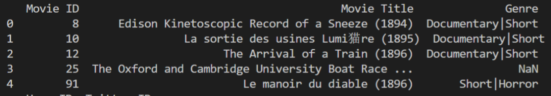 movies.dat包括三个字段:['Movie ID', 'Movie Title', 'Genre']