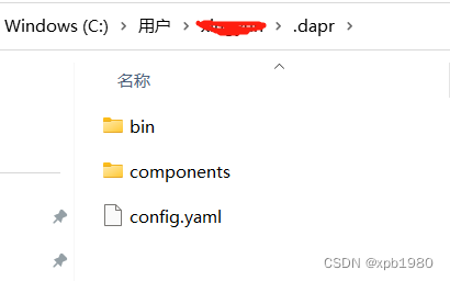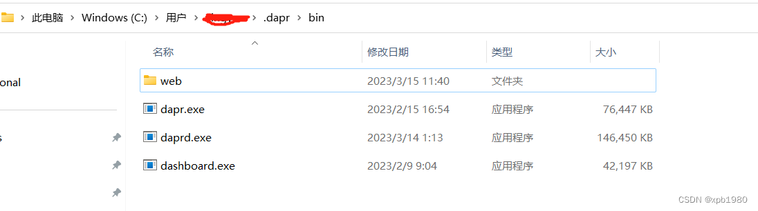 第一步: 参考我的这篇dapr离线安装_xpb1980的博客-CSDN博客博文分别下载dapr、daprd、dashboard的可运行文件包,并解压到对应目录下,windows目录为C:\Users\{用户名}\.dapr\bin目录下,然后把此目录添加到path环境变量里,目录里的文件截图如下:
