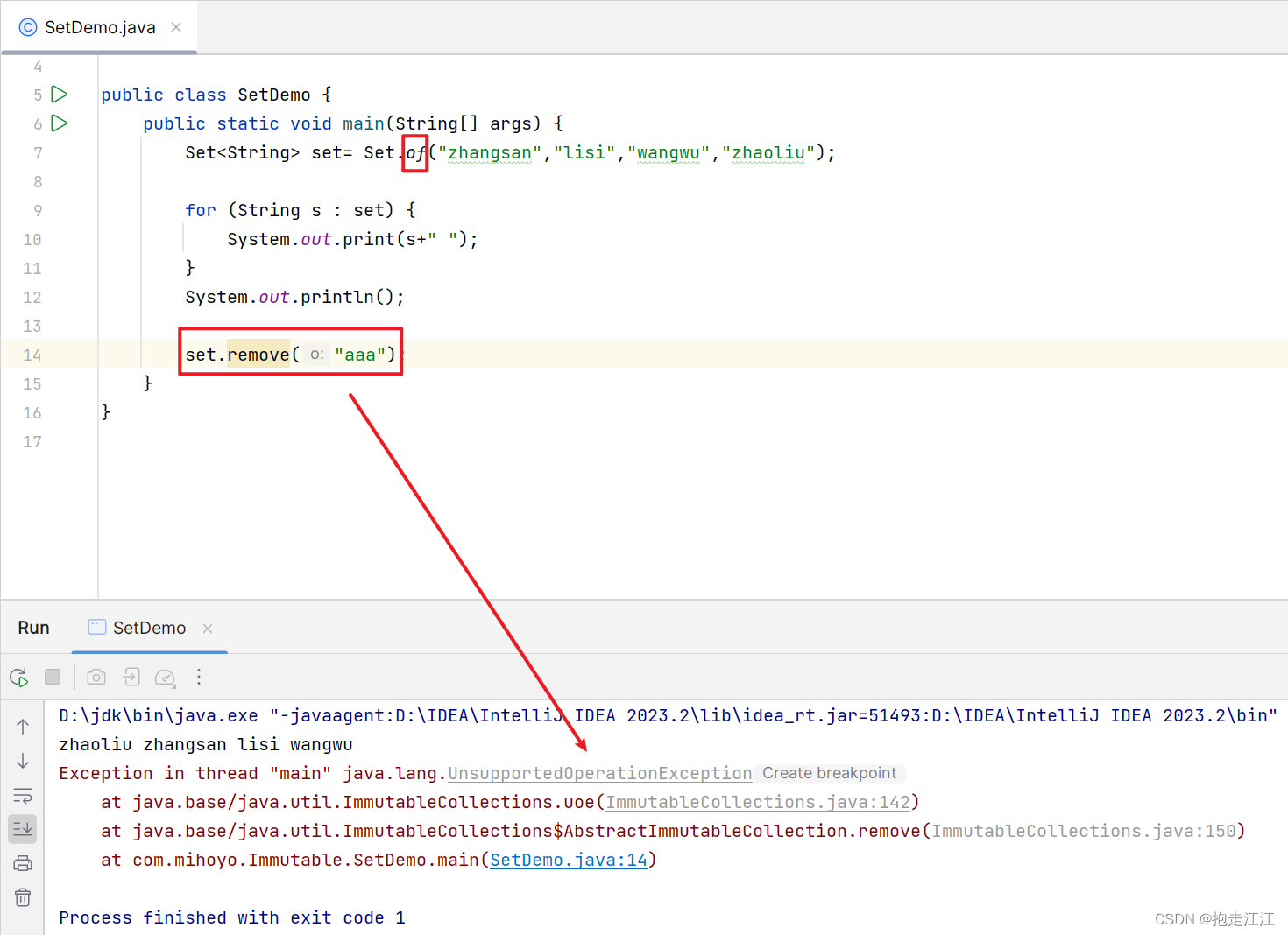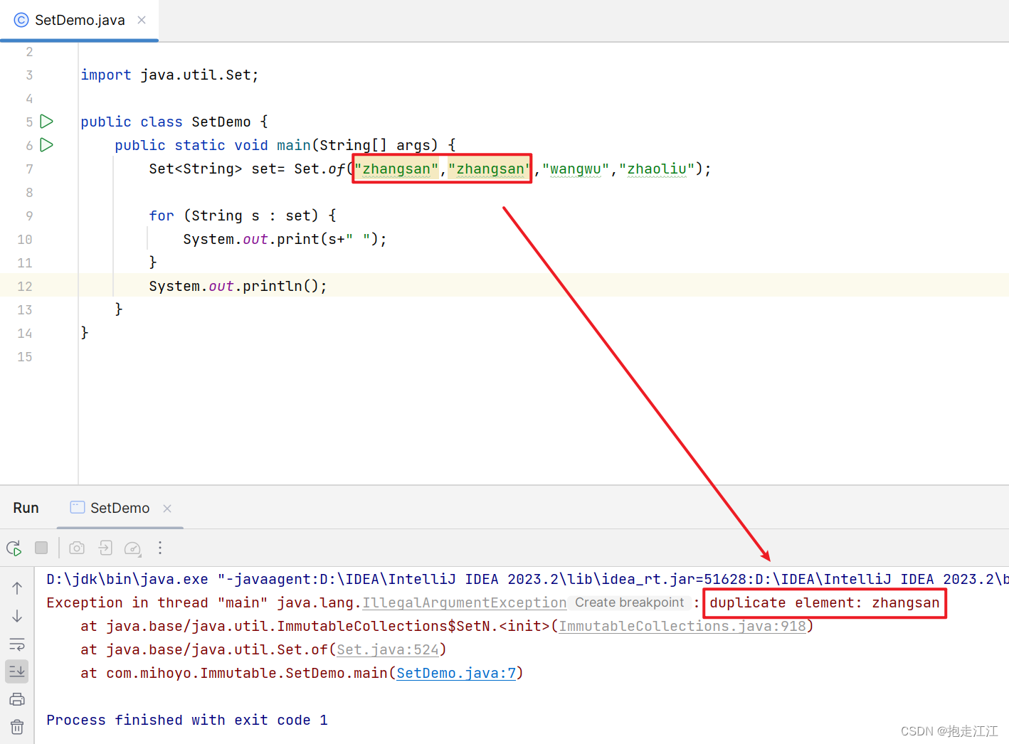 ① 由于 Set 集合是不可重复的,所以当创建一个不可变的 Set 集合时,of 方法中的参数一定要保证唯一性。