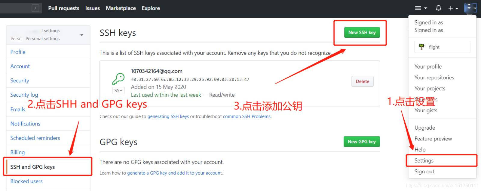 然后在浏览器上登陆你的github账户,然后点击右上角的头像,选择Settings => SHH and GPG keys=> New SHH key 添加生成的 SSH key 添加到仓库中,如下图所示: