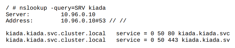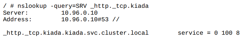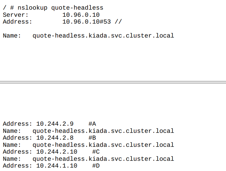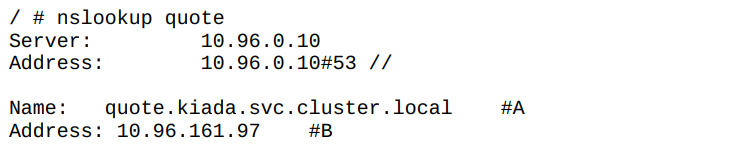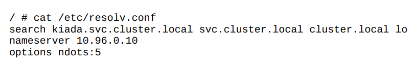 当你尝试解析一个服务时,搜索字段中指定的域名会被附加到名称后,直到找到匹配项。如果你想知道 nameserver 行中的 IP 地址,可以列出集群中的所有服务来查找: