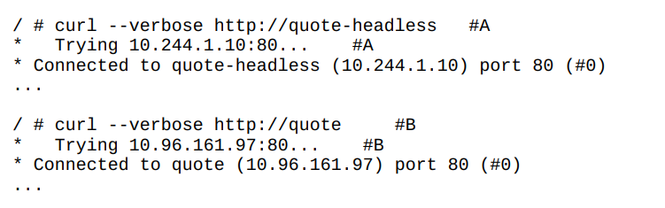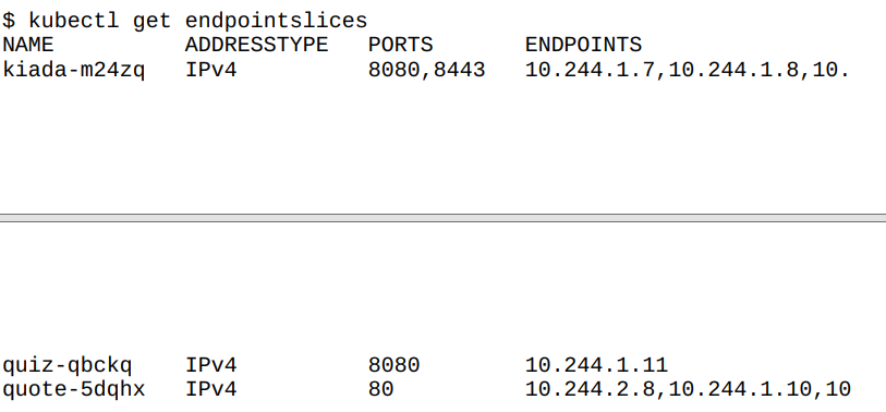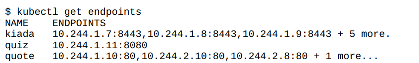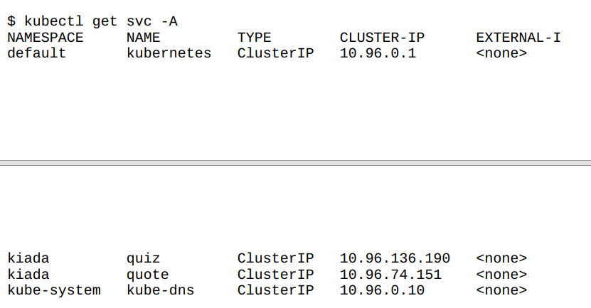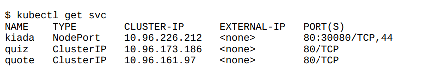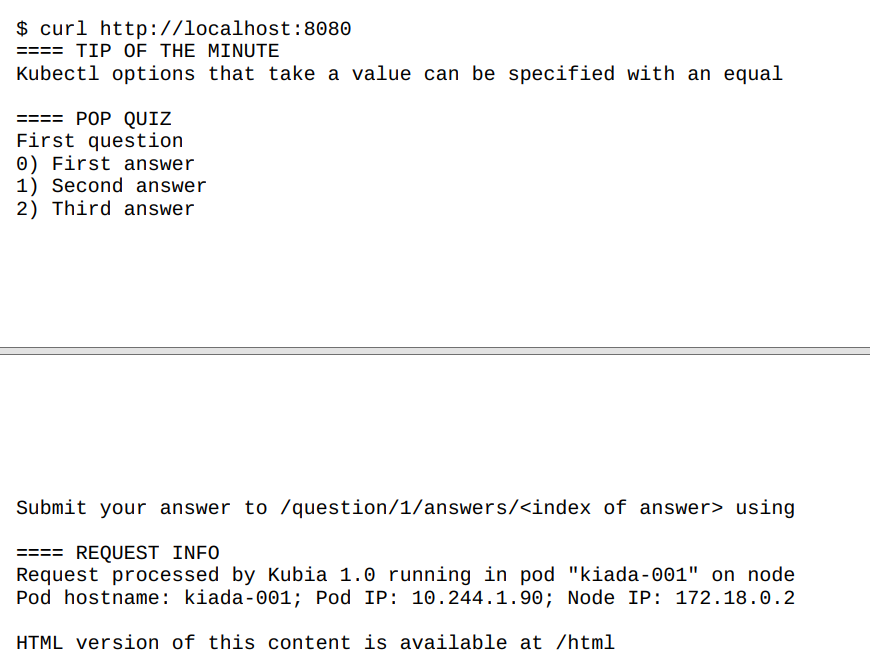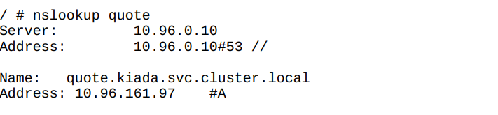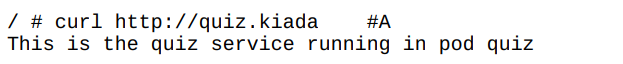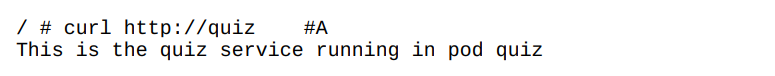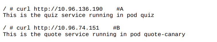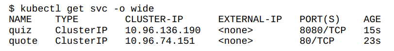 现在检查是否可以访问这两个服务。使用 kubectl get services 显示的服务的集群 IP 地址。在我的例子中,quiz 服务使用的集群 IP 是 10.96.136.190,而 quote 服务使用的 IP 是 10.96.74.151。从 quote-001 pod,我可以按如下方式连接到这两个服务: