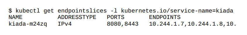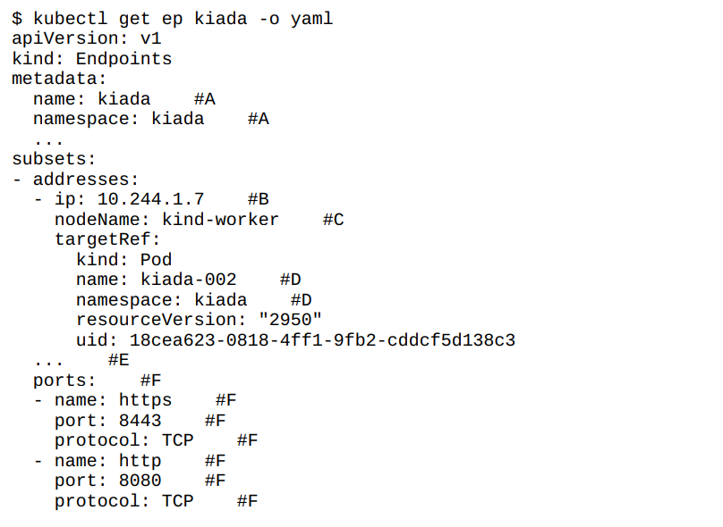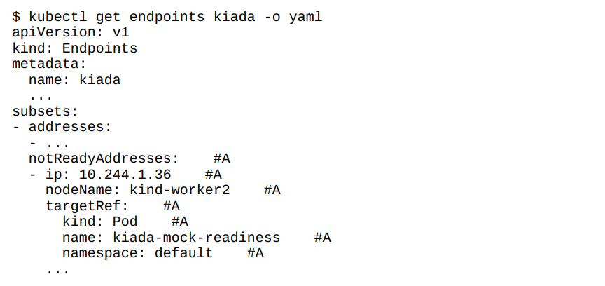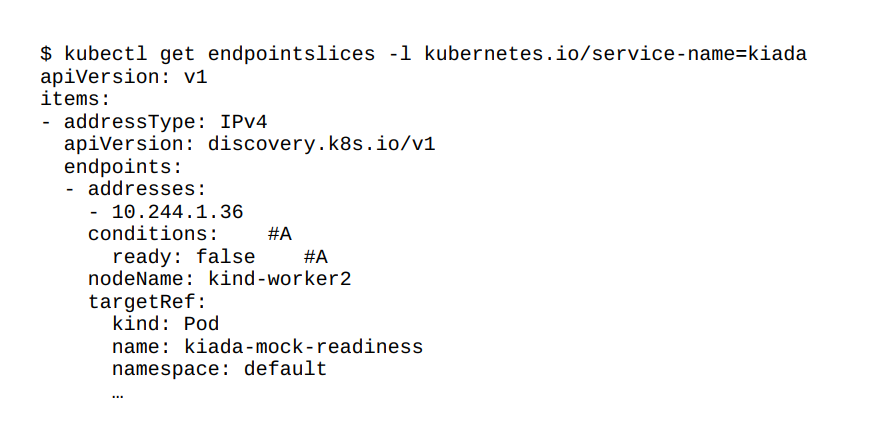 READY 列显示该 Pod 的容器中只有一个处于就绪状态。这个容器是 envoy 容器,它没有定义就绪探针。没有就绪探针的容器在启动后会被视为就绪。由于 Pod 的容器并非全部就绪,Pod 不应接收发送到该服务的流量。你可以通过向 kiada 服务发送多个请求来检查这一点。你会注意到所有请求都由 kiada-001 Pod 处理,它是该服务的唯一活动端点。这可以从与服务关联的 Endpoints 和 EndpointSlice 对象中看出。例如,kiada-mock-readiness Pod 显示在 Endpoints 对象的 notReadyAddresses 中,而不是 addresses 数组中: