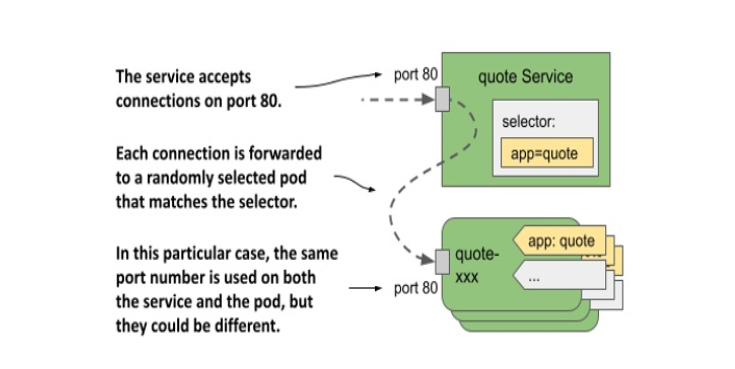 清单定义了一个名为 quote 的 ClusterIP 服务。该服务接收 80 端口的连接,并将每个连接转发到符合 app=quote 标签选择器的随机 Pod 的 80 端口,如下图所示。