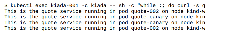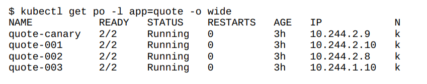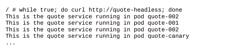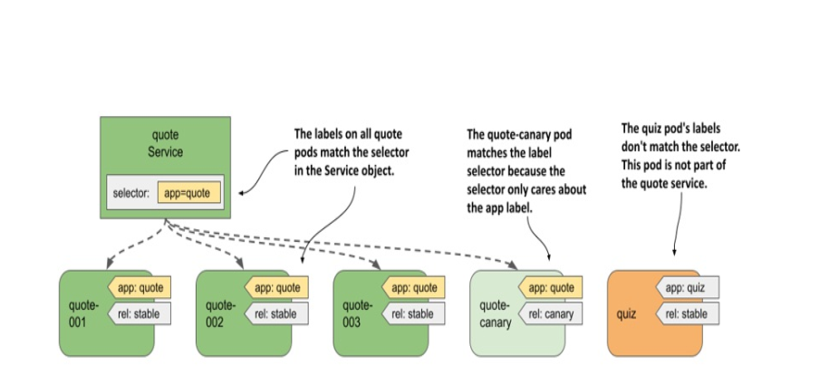 在quote服务中定义的标签选择器是 app=quote,这意味着它会选择所有报价 Pod,包括稳定版和金丝雀版本实例,因为它们都包含键为 app、值为 quote 的标签。Pod 上的其他标签无关紧要。