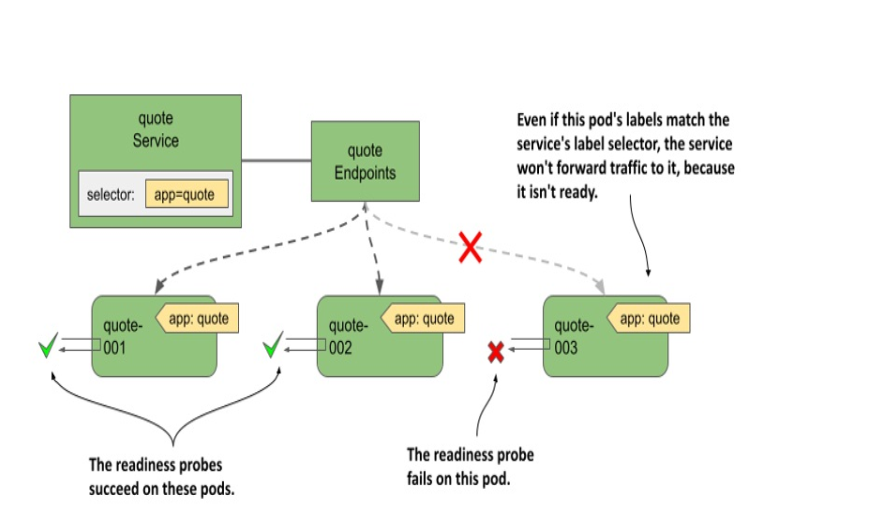 当容器准备就绪时,Pod 会成为其标签选择器匹配的服务的一个端点。当它不再准备就绪时,它将从这些服务中移除。