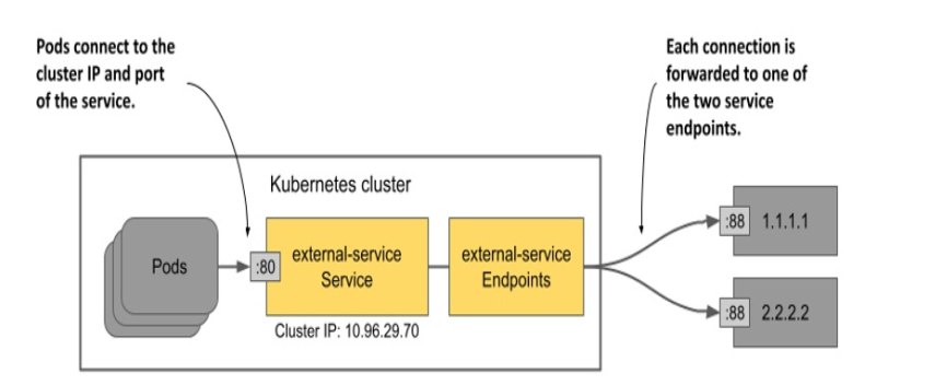 在 DNS 中解析 ExternalName 服务由于 ExternalName 服务是在 DNS 层实现的(仅为该服务创建 CNAME 记录),客户端不会像使用非无头 ClusterIP 服务那样通过集群 IP 连接到服务。它们直接连接到外部服务。像无头服务一样,ExternalName 服务没有集群 IP,如以下输出所示: