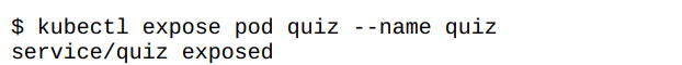 此命令创建一个名为 quiz 的服务,该服务用于暴露 quiz pod。为此,它会检查 pod 的标签,并创建一个具有与该 pod 所有标签匹配的标签选择器的 Service 对象。