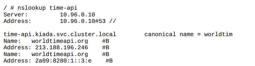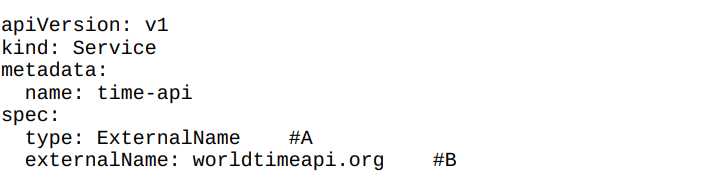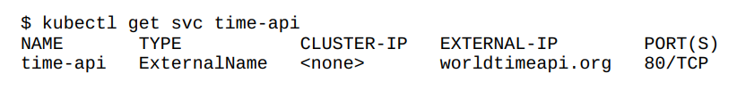 服务创建后,Pod 可以使用域名 time-api.<namespace>.svc.cluster.local(如果它们与服务在同一个命名空间中,则可以使用 time-api)连接到外部服务,而不必使用外部服务的实际 FQDN,如下例所示: