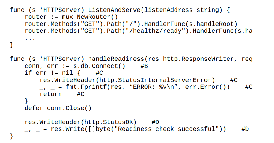 以 Quiz 服务为例。Quiz pod 同时运行一个 HTTP 服务器和一个 MongoDB 容器。如以下清单所示,quiz-api 服务器实现了 /healthz/ready 端点。当它接收到请求时,会检查是否能成功连接到另一个容器中的 MongoDB。如果可以,它会返回 200 OK;如果不行,则返回 500 内部服务器错误。清单 11.12:quiz-api 应用程序中的就绪端点