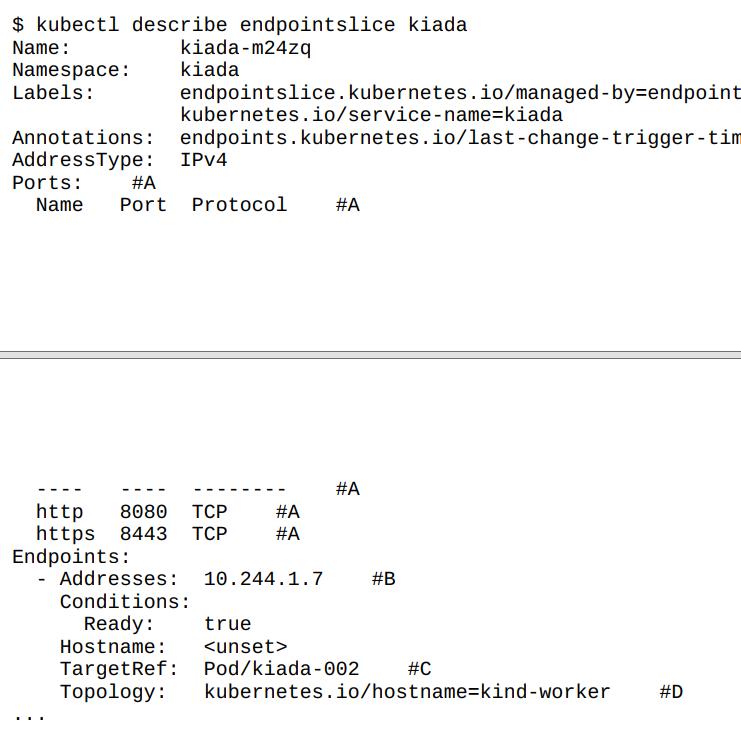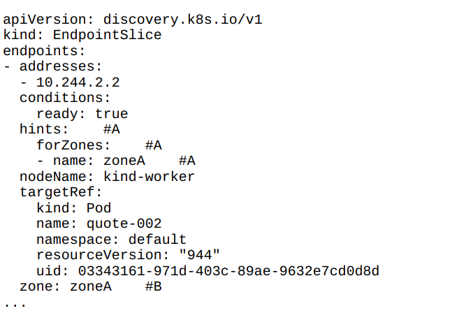 列表中仅显示一个端点。该端点表示在 node kind-worker 上运行的 pod quote-002,该节点位于 zoneA。因此,该端点的提示表明它应由 zoneA 中的 pods 使用。在这个特定情况下,只有 zoneA 应该使用这个端点,但 forZones 数组中可能包含多个区域。 这些提示由 EndpointSlice 控制器计算,EndpointSlice 控制器是 Kubernetes 控制平面的一部分。它根据每个区域可分配的 CPU 核心数将端点分配到各区域。如果一个区域的 CPU 核心数较多,它将被分配比 CPU 核心数较少的区域更多的端点。在大多数情况下,这些提示确保流量保持在一个区域内,但为了确保更均衡的分布,这种情况并不总是发生。