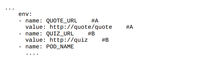 当容器重新启动时,其环境变量包含测验和报价服务的条目。用下面的命令显示它们: