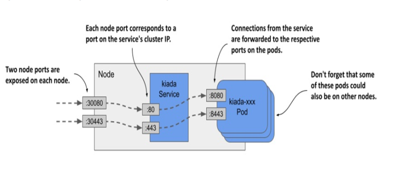 Kubernetes 支持几种类型的服务:ClusterIP、NodePort、LoadBalancer 和 ExternalName。首先你将了解的 ClusterIP 类型仅在集群内部使用。如果你创建一个 Service 对象而没有指定类型,那么得到的就是这种类型的服务。Quiz 和 Quote Pods 的服务属于这种类型,因为它们是由集群内的 Kiada Pods 使用的。另一方面,Kiada Pods 的服务必须能够被外部访问,因此 ClusterIP 类型是不够的。