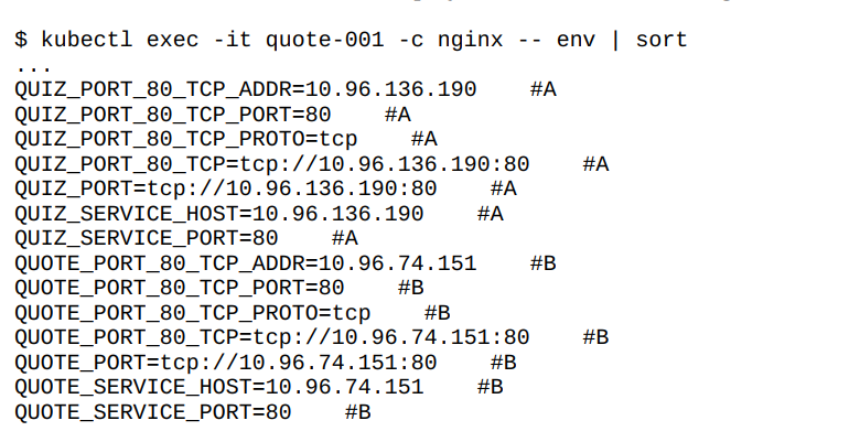 如今,几乎每个 Kubernetes 集群都提供了集群 DNS 服务。在早期情况并非如此。那时,Pod 是通过环境变量找到服务的 IP 地址的。这些变量现在仍然存在。当容器启动时,Kubernetes 会为 Pod 命名空间内存在的每个服务初始化一组环境变量。让我们通过查看一个运行中 Pod 的环境来了解这些环境变量的样子。
