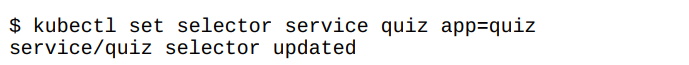 更改服务的标签选择器要更改服务的标签选择器,可以使用 kubectl set selector 命令。要修复 quiz 服务的选择器,请运行以下命令: