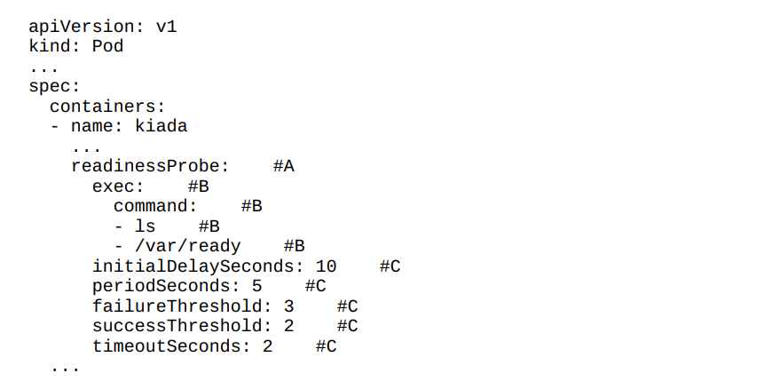 注意 如果容器定义了启动探针,则就绪探针的初始延迟从启动探针成功时开始。第6章中解释了启动探针。