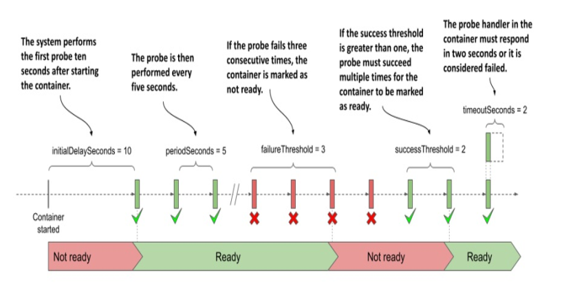 你可能还记得,可以使用以下属性配置给定容器的存活探针运行的时间和频率:initialDelaySeconds、periodSeconds、failureThreshold 和 timeoutSeconds。这些属性也适用于就绪探针,但就绪探针还支持额外的 successThreshold 属性,该属性指定探针必须成功的次数,才能将容器视为就绪。这些设置最好通过图示来解释。下图显示了各个属性如何影响就绪探针的执行以及容器的最终就绪状态。
