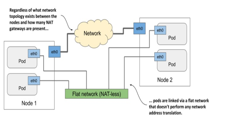 - Pods通过一个平面网络进行通信,该网络允许任何Pod访问集群中的任意其他Pod,而不管连接集群节点的实际网络拓扑如何。