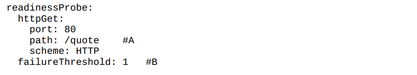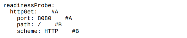 对于运行 HTTP 服务器的容器,定义一个简单的准备就绪探针以检查服务器是否响应简单的 GET / 请求(如以下代码片段所示)要比完全没有准备就绪探针好得多。
