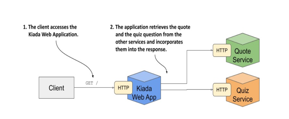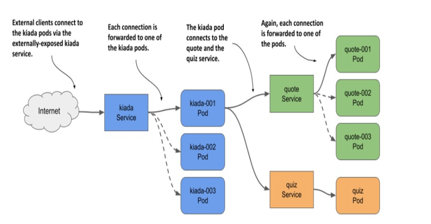 Kiada 套件是解释服务的一个极佳示例。它包含三组提供三种不同服务的 Pod。Kiada 服务调用 Quote 服务以从书中获取引用,并调用 Quiz 服务以获取测验题目。