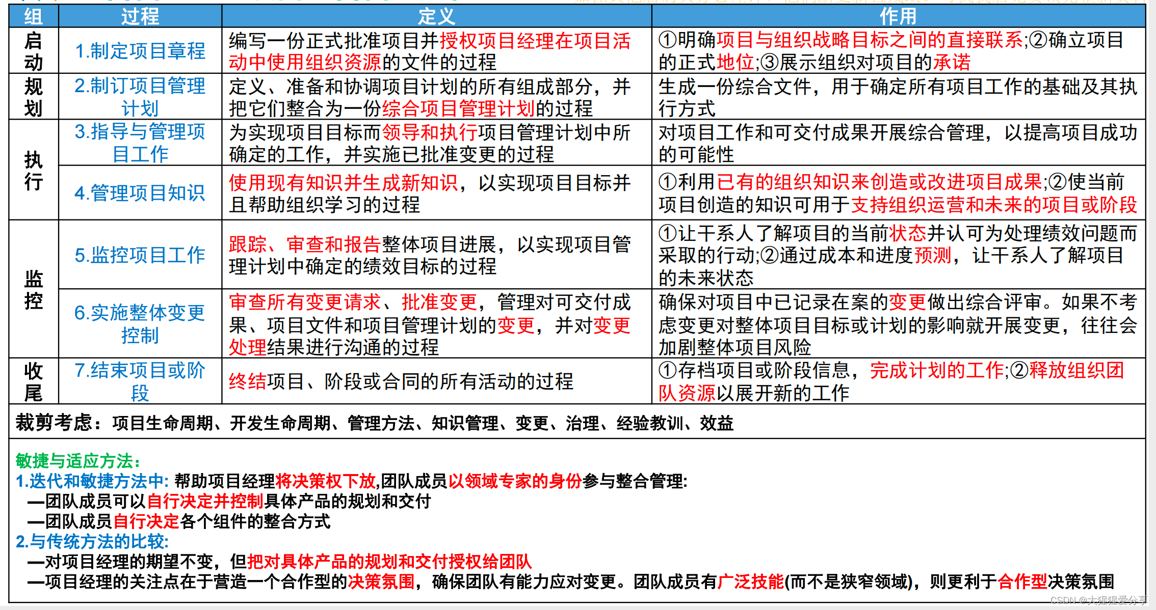 - 项目层面上,项目经理负责指导团队关注真正重要的事务并协同工作。为此,项目经理需要整合过程、知识和人员。