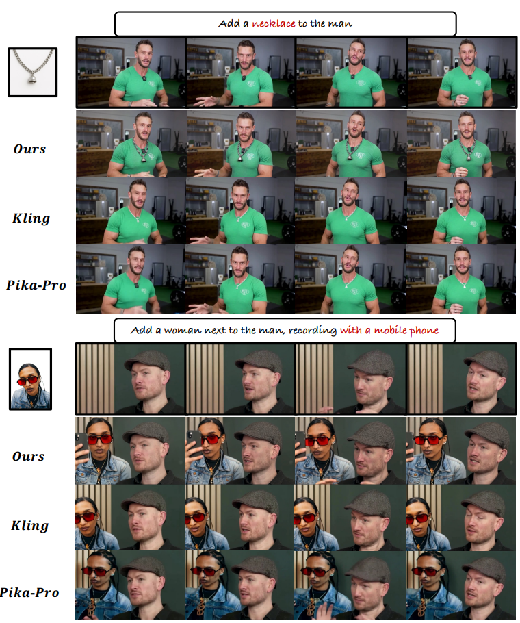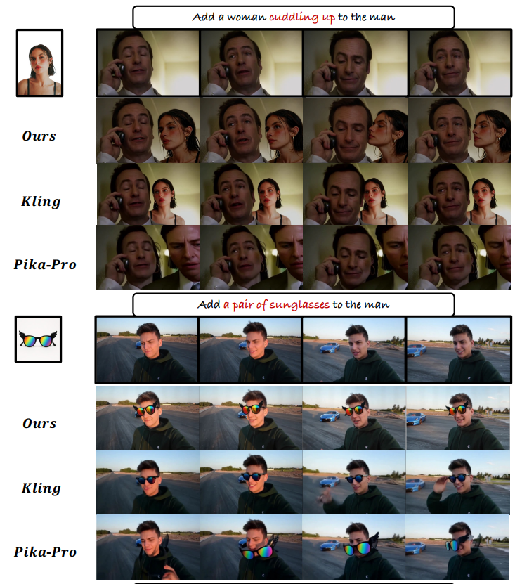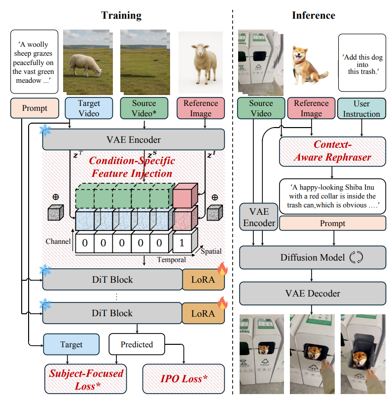 具体而言,为了保持主体-场景平衡,论文引入了一种简单而有效的条件特定特征注入机制,以明确地注入多源条件,并提出了一种新颖的渐进式训练策略,使模型能够平衡来自主体和源视频的特征注入。同时设计了以主体为中心的损失函数来提升主体的细节外观。为了进一步增强插入的协调性,提出了一种“插入偏好优化”方法,通过模拟人类偏好来优化模型,并在引用过程中加入一个上下文感知的重述器模块,将主题无缝地融入到原始场景中。