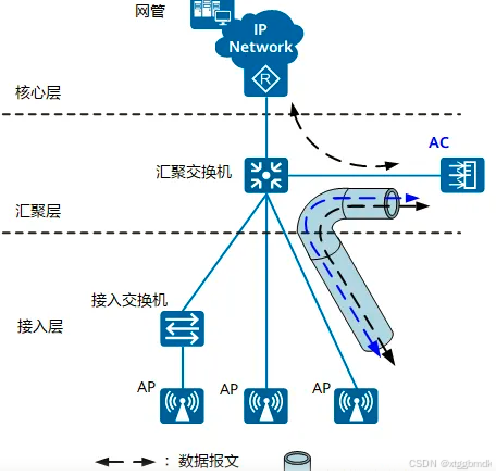 AC的旁挂和直连的方式的使用场景 如图所示,AP的控制和数据流量到达汇聚交换机后,由汇聚交换机转发给AC,AC进行处理后从而返回给汇聚交换机,再转发给核心。这种方式和旁挂式架构中隧道转发的区别在于,隧道转发是通过capwap隧道将报文发至汇聚交换机后,由汇聚交换机转发至AC,AC处理完后再发回汇聚交换机,汇聚交换机再将报文向上层转发。在直接转发模式下,AP的数据报文将不会经过AC,而从上层交换机直接转发,在这种模式下,AC只会对AP的控制报文进行管控,例如AP的上下线,ssid修改等配置操作。所以隧道转发也称为集中转发。