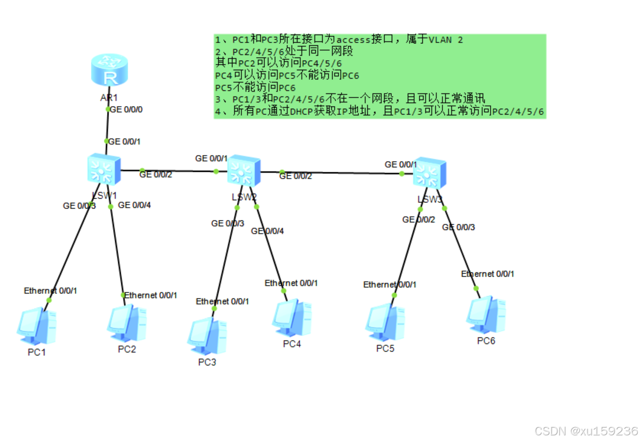 4、所有PC通过DHCP获取IP地址,且PC1/3可以正常访问PC2/4/5/6