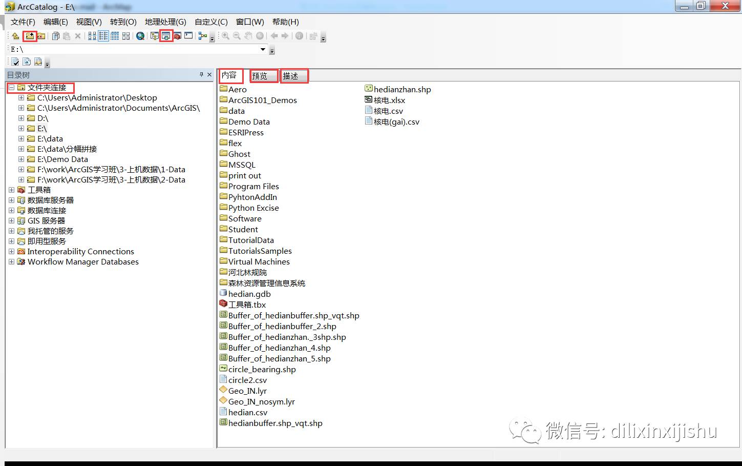 [14]在ArcCatalog应用程序中,添加文件夹连接,浏览目录树、内容、预览、描述等,还可以打开搜索窗口,搜索内容。