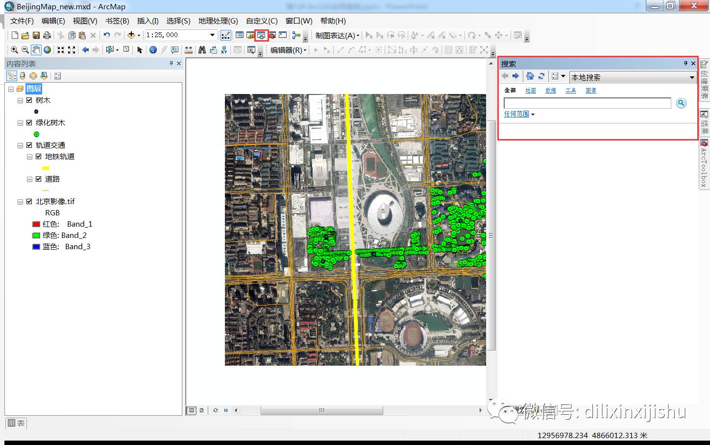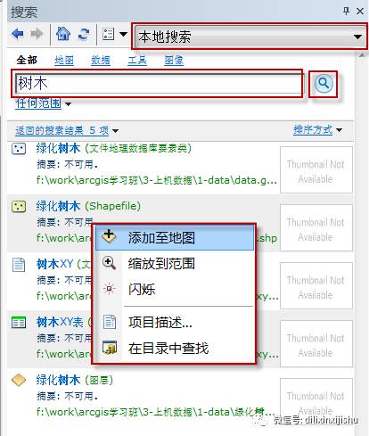 [9]待索引创建完成,单击【确定】,回到【搜索】窗口,选择【本地搜索】,选择【全部】内容,输入【树木】,单击搜索,返回搜索结果如下,右键可以【添加至地图】;