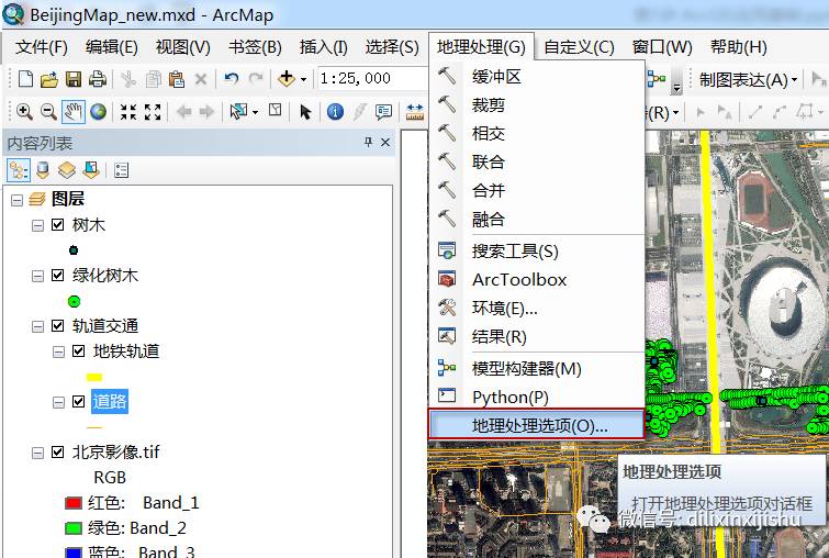 [1]本节将用到地理处理工具,为了便于查看工具运行结果,关闭工具的后台处理选项。单击菜单【地理处理】->【地理处理选项】;