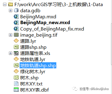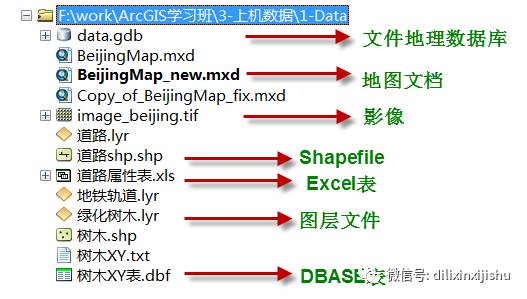 [1]在【目录】窗口,双击【文件夹连接】下的【1-Data】连接,查看包含的数据内容,以及地图文档、文件地理数据库、影像、Shapefile文件、Excel表格、DBASE表、图层文件的图标样式,如下图;