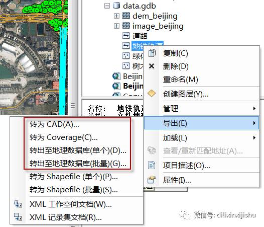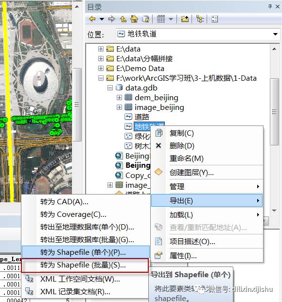 [3]输出单个Shapefile。在【目录】窗口,选择【1-Data】->【data.gdb】->【地铁轨道】,右键单击,选择【导出】->【转为Shapefile(单个)】;