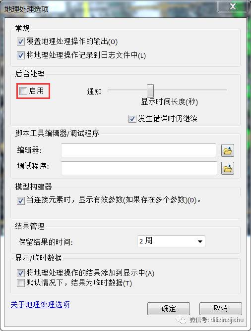 [2]弹出【地理处理选项】窗口,取消勾选后台处理下的【启用】,如下图,单击【确定】关闭窗口;