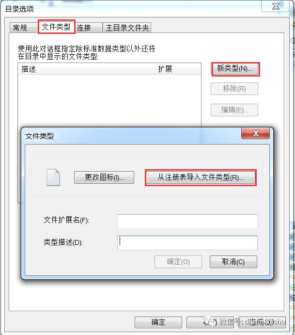 [4]切换到【文件类型】页,单击【新类型】,弹出【文件类型】窗口,单击【从注册表导入文件类型】,选择【TXT Document】,如下图;