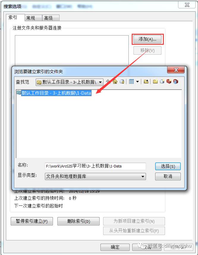 [7]弹出【搜索选项】窗口,单击【添加】,选择【1-Data】文件夹连接,单击【选择】,如下图;