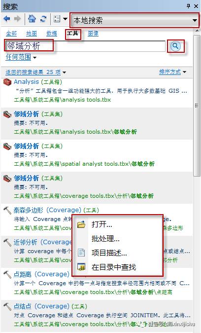 [10检索工具。在【搜索】窗口,选择【本地搜索】,选择【工具】,输入【邻域分析】,单击搜索,返回搜索结果如下,右键可以打开工具箱或工具,如下图;