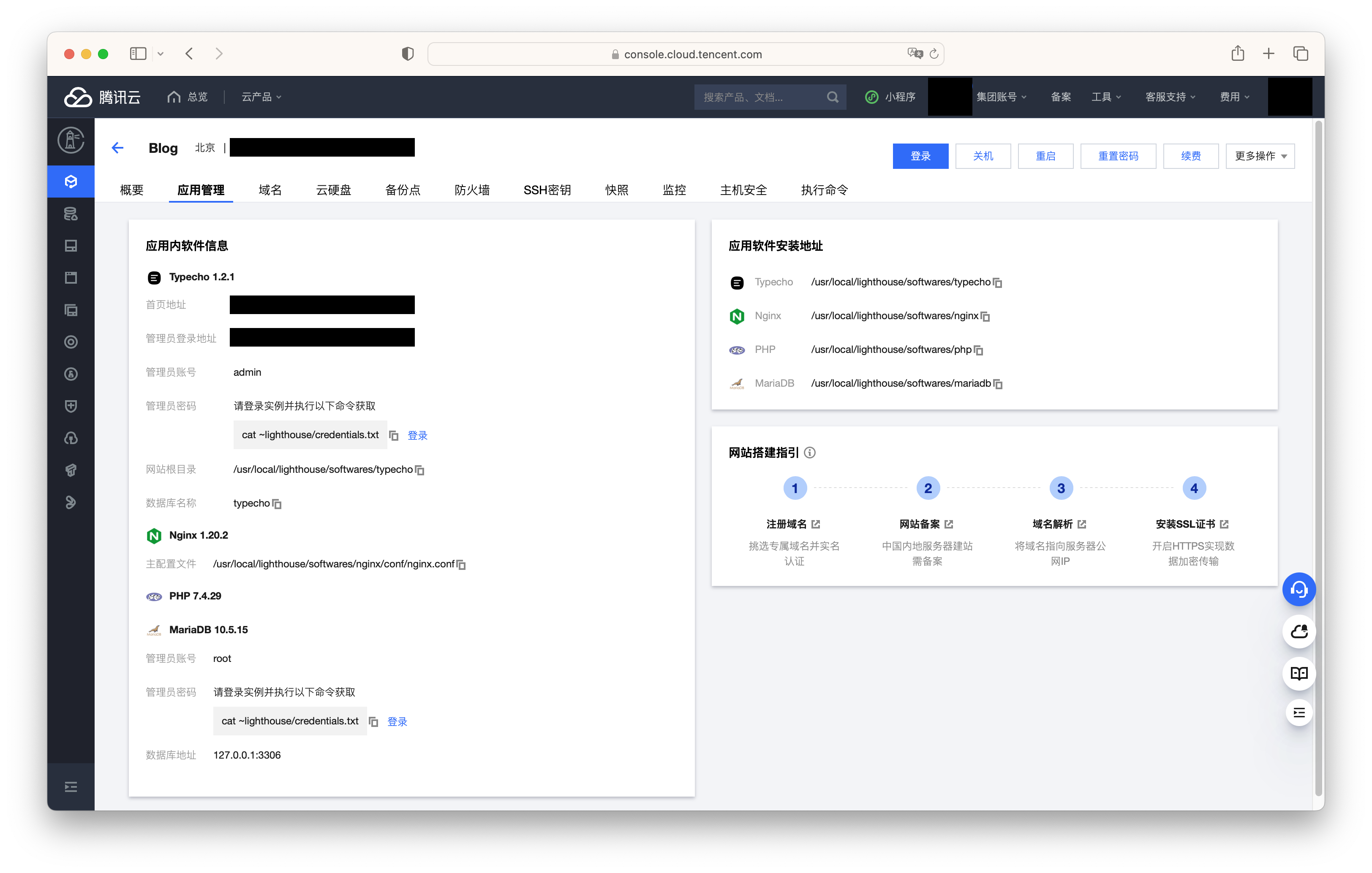 Typecho博客网站迁移:MySQL ➡️ MarialDB 由于服务、价格等因素更换云服务器是很常见的情况,本文记录了Typecho博客网站从原服务器迁移至新服务器的操作过程,其中涉及了Mysql数据库到MarialDB数据库的迁移。新服务器为腾讯云轻量服务器,镜像采用typecho,初始服务器状态如图所示。将网站从迁移主要有如下几个步骤:Typecho自定义配置迁移➡️数据库迁移➡️Nginx配置➡️自定义主题配置。