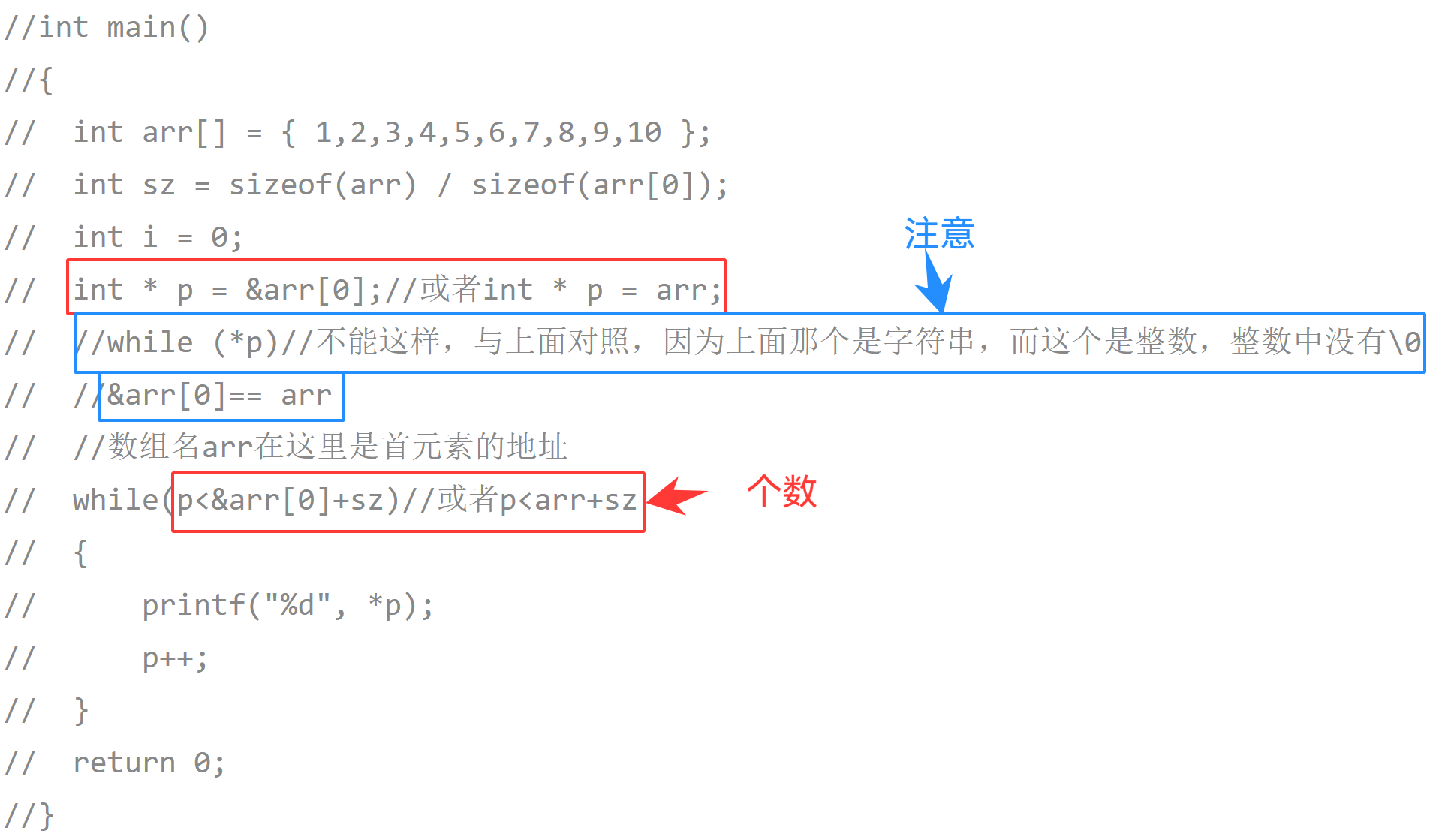 arr是首元素的地址,只有sizeof和 &数组名 中表示一个数组,其他情况表示首元素地址