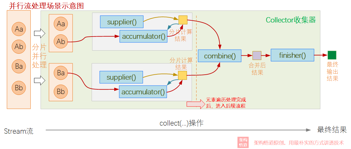 (left, right) -> { left.addAll(right); return left; },也就是对于并行操作生成的各个子ArrayList结果,最终通过list.addAll()方法合并为最终结果。 -