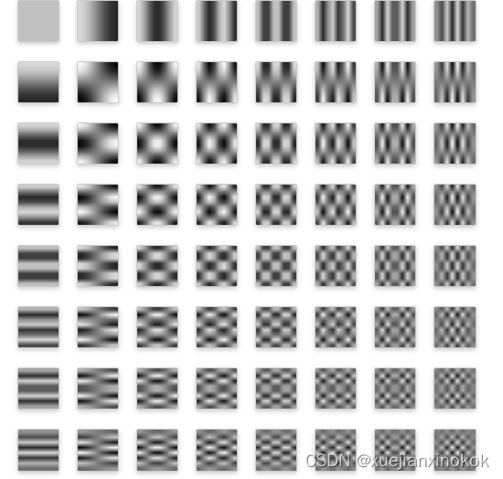 图像被分解为8x8块,每个块分别进行分解(利用基图像)。我们使用一组频率来确定每个像素的亮度或暗度,然后是另外两组用于颜色,一组用于红绿色,另一组用于蓝黄色。我们为每个块使用的频率个数决定了JPEG图像的品质。