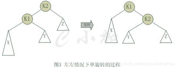 上图是左左的情况,k2结点不满足平衡性,它的左子树k1比右子树z深两层,k1子树中更深的是k1的左子树x,因此属于左左情况。