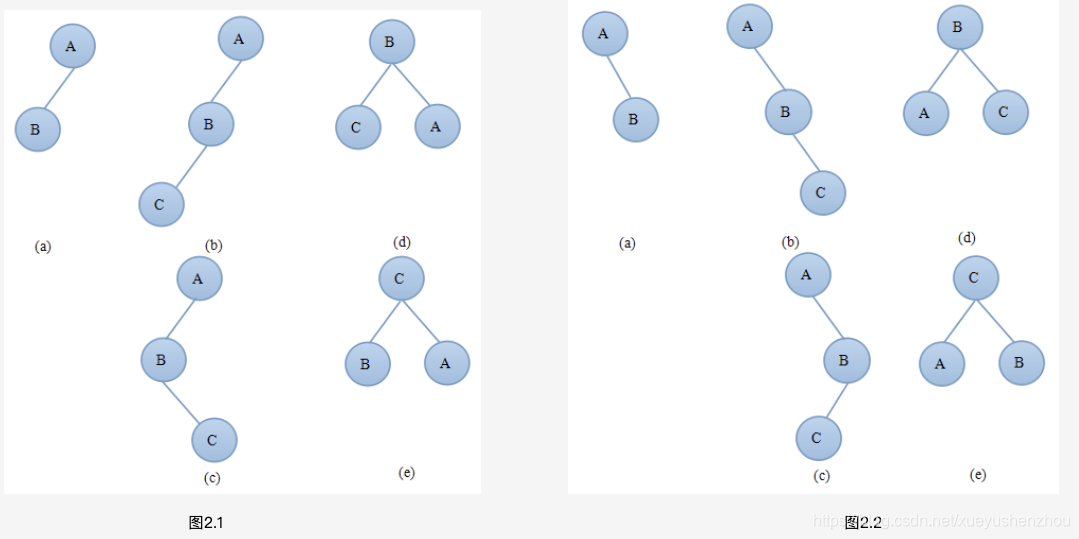 当出现图2.2(c)中的情况时需要先对A的右子树B进行右旋,然后再进行左旋操作,旋转后得到如图2.2(e)所示的平衡二叉树。