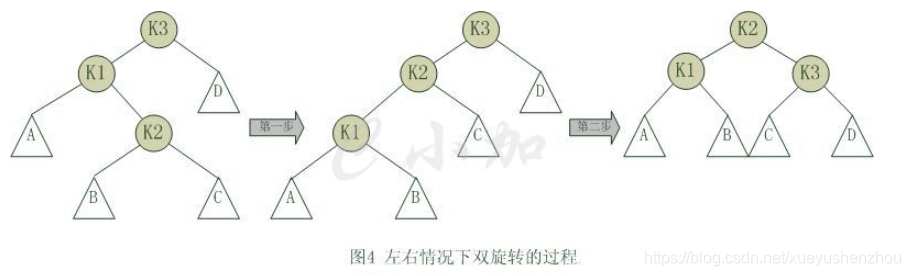 对于上图情况,为使树恢复平衡,我们需要进行两步,第一步,把k1作为根,进行一次右右旋转,旋转之后就变成了左左情况,所以第二步再进行一次左左旋转,最后得到了一棵以k2为根的平衡二叉树。