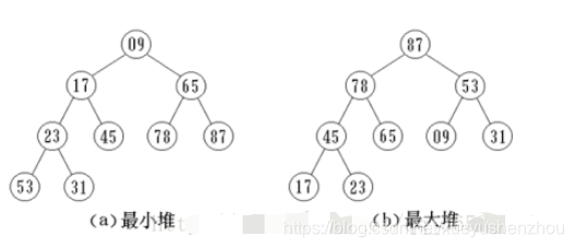 堆有两种结构,一种称为大顶堆,一种称为小顶堆,如下图。