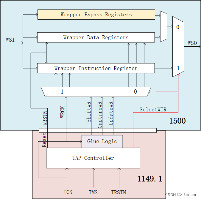 【JTAG】1500协议详解 随着集成电路的规模不断扩大,1149.1的板级测试无法满足要求越来越高的芯片测试需求。芯片规模变大后,测试需求不在是一次测试整片芯片,而是芯片分为好几个区域去测试,而1500协议正是对1149.1在该方面的一个补充即1149.1主要测试板级间的互连,而1500用来测试芯片内不同core之间的互连。IEEEStd1500已经为包含不同模块的集成电路(ICs)开发了一种可测试性设计标准方法。............